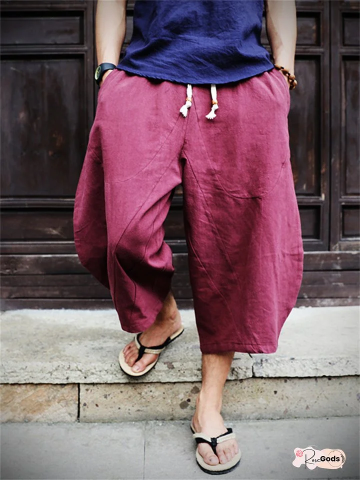Men's Linen Shorts Capri Pants Pocket Drawstring Elastic Waist Plain Comfort Breathable Calf-Length Casual Holiday Going out Linen / Cotton Blend Stylish Classic Black White