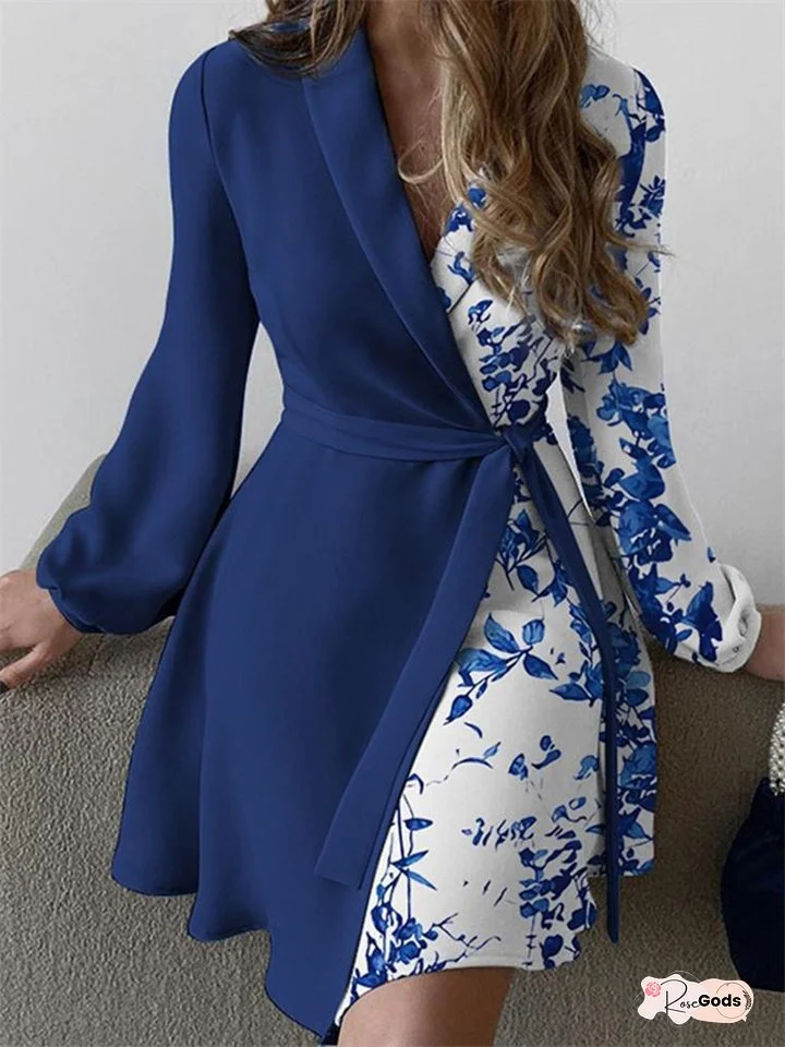 Mid-calf temperament commuter lace-up printed skirt lapel simple fashion temperament Slim women's dresses