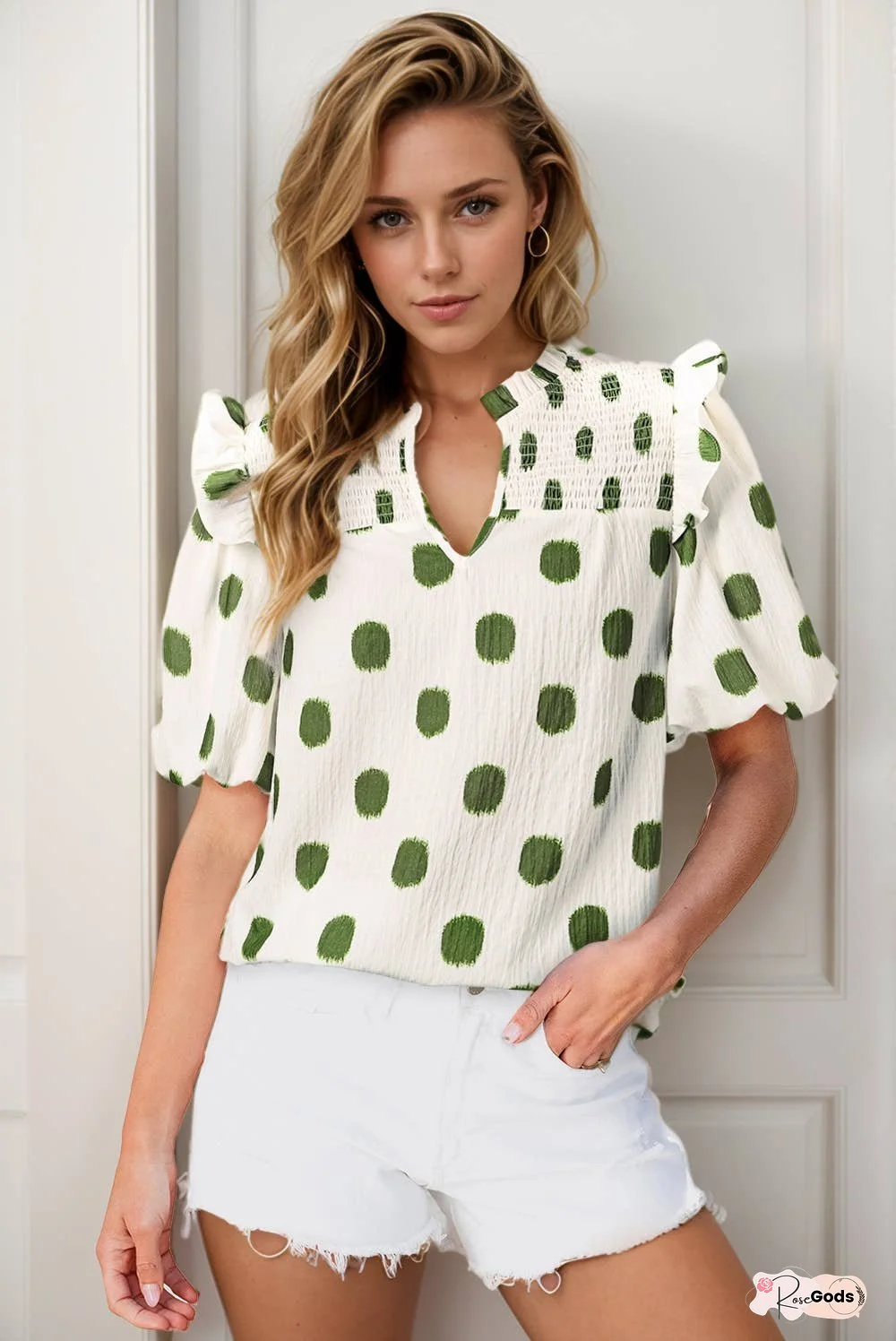 Ruffles on shoulder, shirred yoke and balloon sleeve.