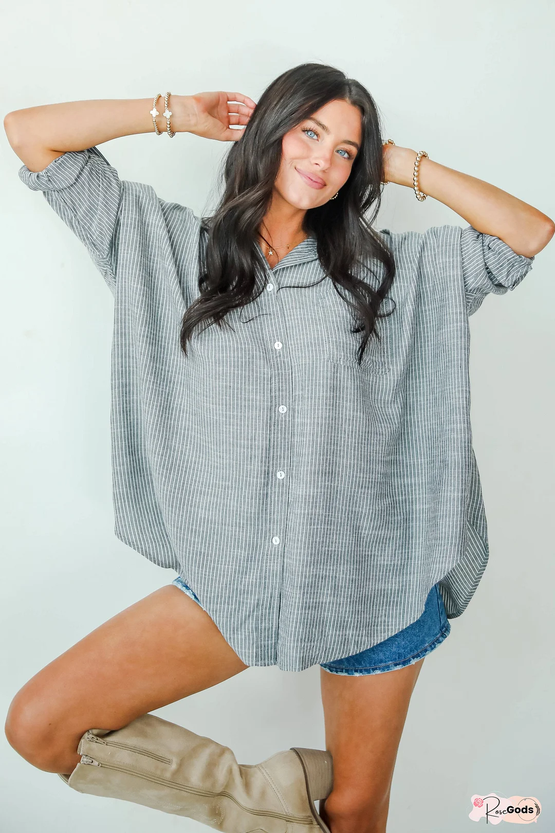 Effortlessly demand attention the moment you walk into a room wearing the Polished Influence Charcoal Striped Button-Up Blouse! Designed with a relaxed. oversized fit. it offers a cool. breezy silhouette perfect for layering or wearing solo. The classic charcoal stripes add a timeless. versatile touch. while the crisp button-up front and collared neckline keep it polished and chic. Crafted from lightweight. breathable fabric. this blouse is perfect for tucking into high-waisted jeans. pairing with tailored shorts. or wearing open over a tank for an easy. off-duty vibe. It's the ultimate wardrobe staple for casual. yet sophisticated style!