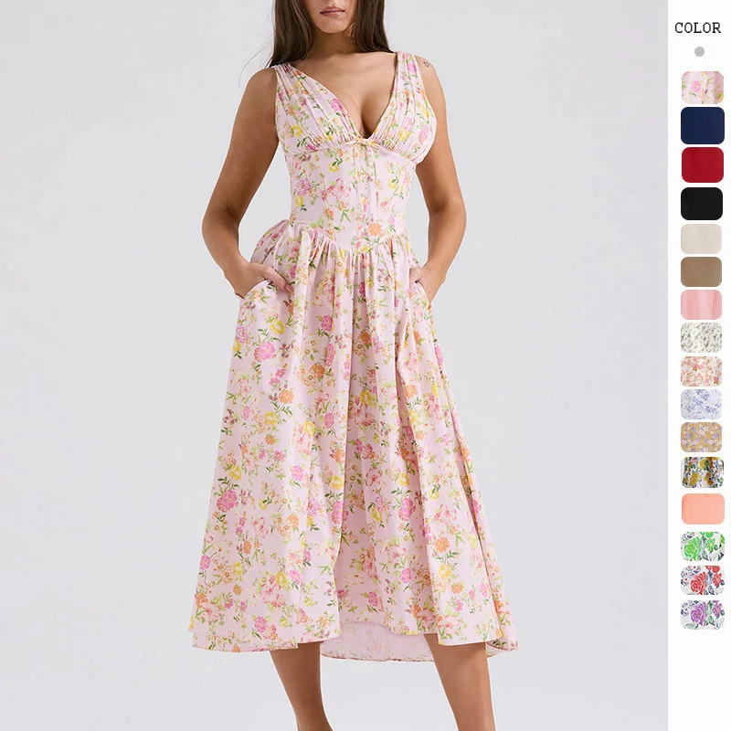 This celebrity-style maxi dress features a romantic V-neck, sleeveless design, and charming floral prints (available in multiple patterns like pink&yellow flowers, red/navy blue apricot, etc.). The ruched bust and flowy long skirt create an elegant silhouette, while side pockets add practicality. It fits most body types (S-XL) and is perfect for daily wear, dates, or events in Europe & America.