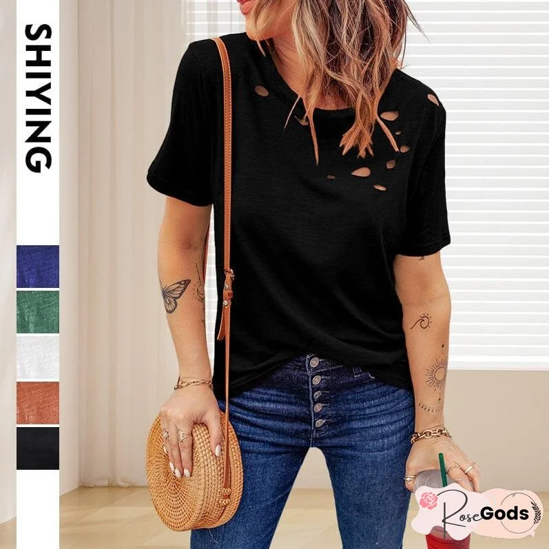 Elevate your everyday style with this women's short-sleeved T-shirt. Whether you're running errands or meeting friends for coffee, this top offers both style and comfort. The solid color and ripped detailing give it a modern edge, while the loose fit and soft fabric make it a joy to wear all day long. Add this versatile piece to your wardrobe and enjoy effortless style wherever you go.