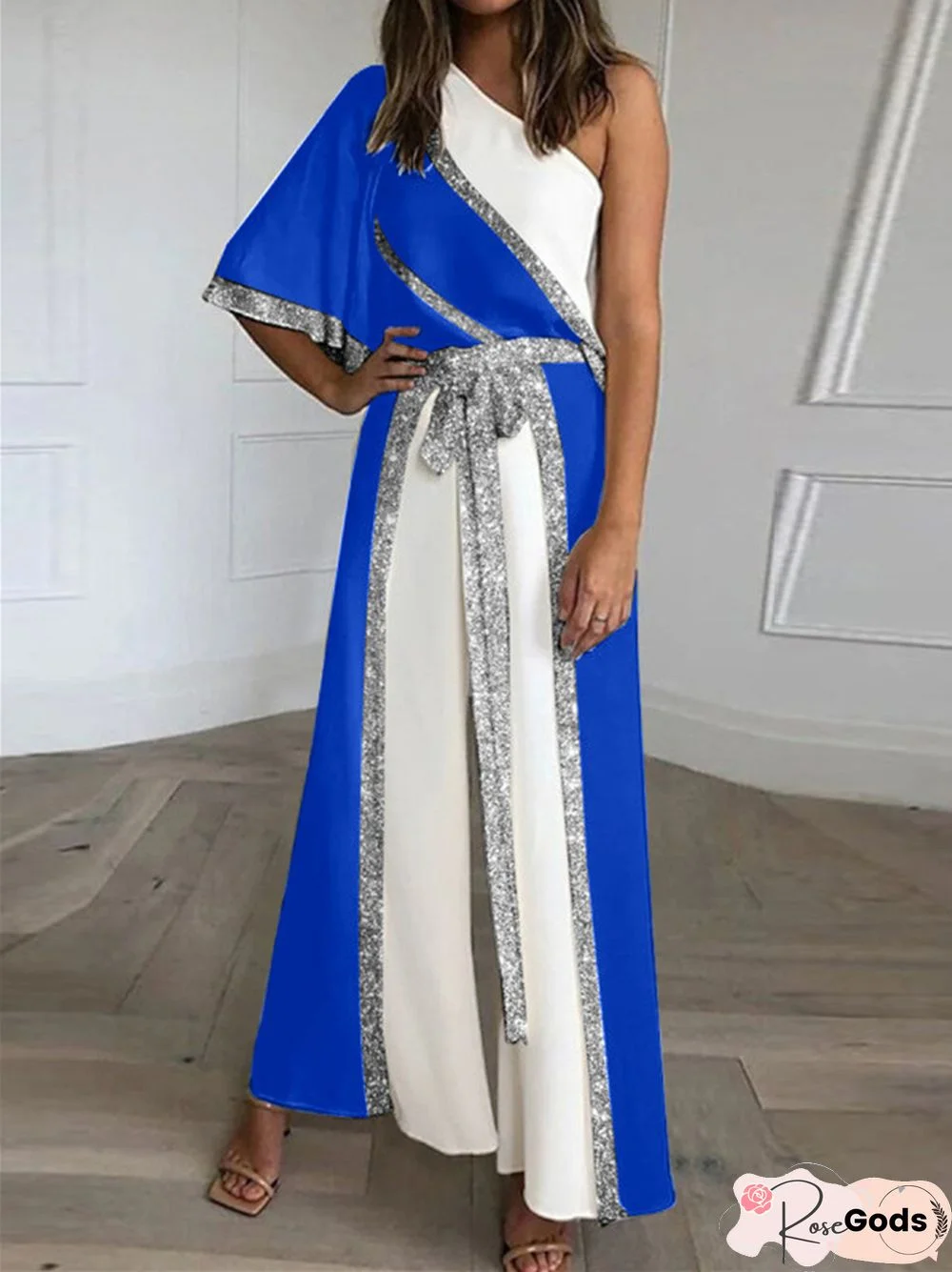 Women's New Fashion Solid Color Diagonal Neck One-Piece Wide Leg Pants