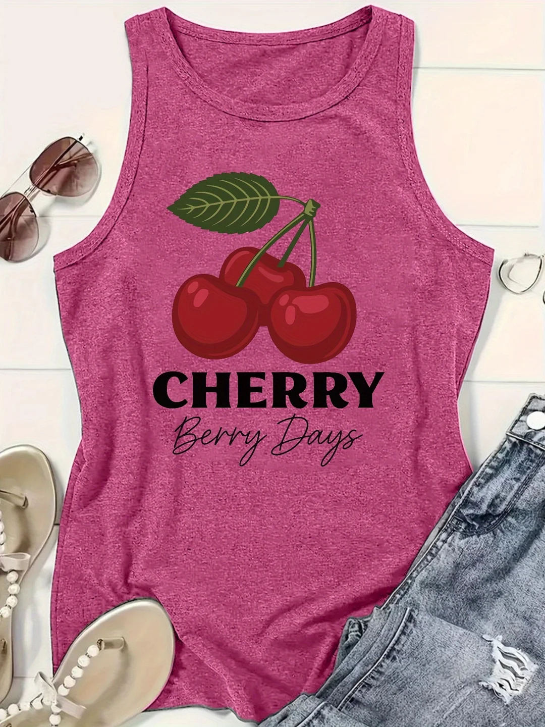 Women's Sleeveless Cherry Print Vest Top - Vibrant Pink Casual Loose Fit Breathable Summer Tank With Round Neck For Spring & Summer Outfits, Outdoor Clothing, Comfortable Fabric, Relaxed Fit, Warm Weather Wear, Lightweight Material, Trendy To